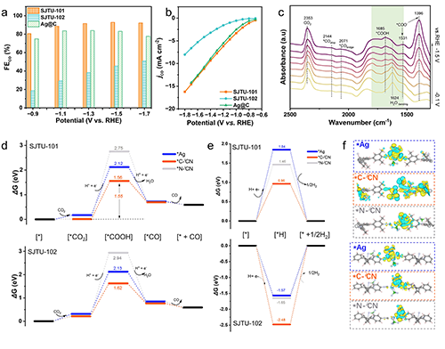 圖1. 基于Ag-C配位的2D MOF的制備示意圖。(a)Ag-iCN的合成(下圖:Ag-iCN的分子結構(左),Ag-iCN分子的晶體堆積空間分布(右))。SJTU-101(b)和SJTU-102(c)的合成。