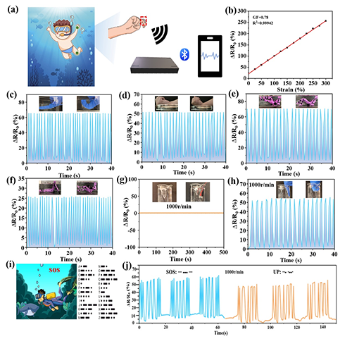 隨著人們?cè)黾訉?duì)游泳潛水等水下活動(dòng)的關(guān)注,水下信號(hào)傳輸和體感技術(shù)的發(fā)展需求也日益增高。柔性可穿戴傳感器可以捕捉和記錄實(shí)時(shí)運(yùn)動(dòng),對(duì)保證水下安全起著至關(guān)重要的作用。與傳統(tǒng)的基于復(fù)合材料的可穿戴傳感器設(shè)備相比,導(dǎo)電水凝膠具有優(yōu)異的物理和化學(xué)性能,如韌性、透明度、粘附性和良好的導(dǎo)電性,這些使其成為最有前途的水下可穿戴傳感器的候選材料之一。目前,盡管基于導(dǎo)電水凝膠的可穿戴傳感器在常規(guī)環(huán)境下已經(jīng)取得了一些重大進(jìn)展,但由于其在水生環(huán)境中的不穩(wěn)定性,實(shí)現(xiàn)其在水下的應(yīng)用仍然是至關(guān)重要且極具挑戰(zhàn)性的。為了實(shí)現(xiàn)導(dǎo)電水凝膠在水生環(huán)境中的使用,需要考慮保水性、抗膨脹性、韌性、黏附性、線性靈敏度傳感、長期使用等綜合性能,但這在以往的報(bào)道中卻很少見。