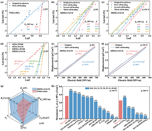 針對上述問題,北京科技大學(xué)查俊偉教授團(tuán)隊(duì)通過一種重新設(shè)計(jì)分子結(jié)構(gòu)單元的策略,設(shè)計(jì)了一種兼具高玻璃化轉(zhuǎn)變溫度(256 ℃)和寬帶隙(4.58 eV)的脂環(huán)聚酰亞胺(PI),在高電場和高溫條件下,其電導(dǎo)率比傳統(tǒng)PI低一個數(shù)量級以上。在200 ℃下,脂環(huán)PI的放電能量密度達(dá)到 4.54 J cm-3且充放電效率保持在90%以上,高于商業(yè)BOPP電容膜在室溫下的放電能量密度。此外,脂環(huán)PI的熱解殘?zhí)柯实停谒拇坞姄舸┭h(huán)后仍能保持 93% 的介電擊穿強(qiáng)度。該研究首次提出了基于氣相和凝聚相雙重自愈機(jī)制來探索高溫PI電介質(zhì)的自愈能力。脂環(huán)PI在高溫下的高能量密度和卓越的自愈能力進(jìn)一步表明了PI電介質(zhì)薄膜電容器在極端條件下的應(yīng)用前景。