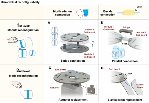 可重構軟體機器人就像一種柔軟的積木,由各種功能模塊組成,可以輕松拆卸并重新安裝成任何想要的形式。一方面,它具備可重構機器人可重用性、可互換性和可擴展性的優(yōu)勢,減少了重新設計時間,降低了制造成本,并提高了產品的通用性;另一方面,它也繼承了軟體機器人柔順、安全的特性,在應對非結構化環(huán)境和處理脆弱的目標物時具備顯著優(yōu)勢。現(xiàn)有的大多數(shù)模塊在設計上都有固定的結構和功能,因此當多個模塊組成的機器人需要調整時,唯有通過更換不同的模塊才能實現(xiàn)重新配置,這對于中間位置的模塊替換以及模塊線纜的重新規(guī)劃是十分不友好的。本研究提出了一種分級可重構的策略。這種策略不僅使機器人具備傳統(tǒng)模塊化方法的優(yōu)勢,即通過模塊間的組合來構建不同的機器人(第一層重構);還能通過重編程模塊內的彈性引導元件,來提供模塊的多種運動模式(第二層重構)。該設計策略克服了以往模塊化軟體機器人運動模式不可改變的缺陷,將模塊化的設計方法提升到了更高的維度,為機器人調整各種構型和功能提供了更多選擇。例如,利用模塊間的重新配置,可以構造出蠕蟲機器人、全向爬行機器人和軟體機械手等應用實例,此外,由多個模塊串聯(lián)而成的軟體機械臂也能夠通過模塊運動模式的重編程,來重新設計運動軌跡和工作空間,而不必進行整個模塊的更換。該方法顯著降低了模塊化軟體機器人的操作難度和成本。