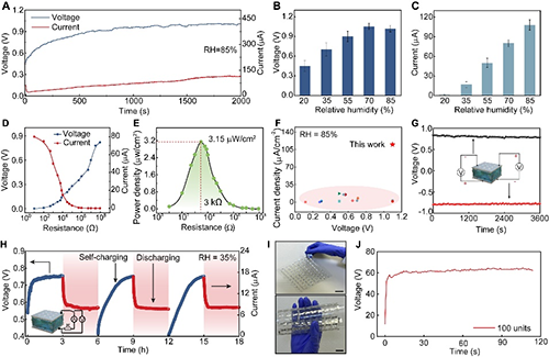 圖4. 基于TENG的動(dòng)態(tài)能量收集性能以及MEG+TENG整合后的雙模能量收集性能