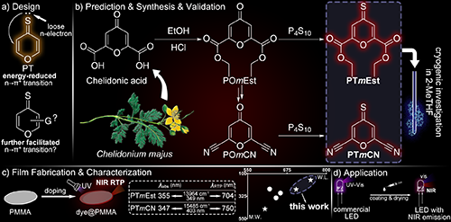 具有長波長的小分子量發(fā)光體引起了廣泛的研究型興趣。該工作將吸電子基團(tuán)連接到4H-吡喃-4-硫酮核心上,進(jìn)一步降低了硫代羰基化合物固有的低激發(fā)能,所得的小分子量磷光體摻雜進(jìn)聚合物基質(zhì)后均具有近紅外(NIR)RTP發(fā)射。其中一個磷光體分子量僅為162,卻能發(fā)射峰值為750 nm的RTP,且其Stokes位移高達(dá)15485 cm-1(403 nm)。該工作為使用小分子量發(fā)光體獲得NIR RTP提供了一種有趣的策略。
