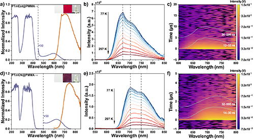 圖3 PTmEst@PMMA(上)和PTmCN@PMMA(下)室溫下的吸收(藍(lán)線)和發(fā)射(紅線)光譜(左)、變溫光譜(中)和二維衰減曲線(右)。