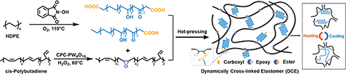 為此,浙江大學劉平偉研究員、王青月研究員報道了一種低溫、可控的廢棄聚烯烴氧化裂解方法,裂解產物為半結晶的氧化功能化低聚物,利用裂解過程中引入的羧基,可不經分離直接與無定形環氧化順丁橡膠發生動態交聯反應,制備一種全新、可回收的動態交聯彈性體(圖1)。該彈性體實現了物理結晶與動態化學交聯的高效協同,其機械性能超過部分商用聚烯烴彈性體,例如POE 8150等。