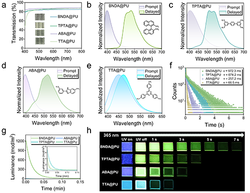 作者篩選了系列氨基芳環分子制備了柔性交聯聚合物薄膜。在該體系中,大量的羰基和氮原子促進了三線態激子的生成,網絡結構下磷光體的運動被抑制,確保了三線態激子的穩定性(圖1a)。聚合物薄膜表現出優異的耗氧特性,在紫外激發后顯示出優異的發光特性,包括長的磷光壽命和高的量子產率(圖1b,c)。在此基礎上,作者對薄膜的光物理性質及其發光機制進行了進一步表征。薄膜表現出高的透明性,在紫外光輻照后,表現出高效的余輝發射,其壽命最長可達972.3ms,亮度最高可達1.2cdm-2(圖2)。TPTA@PU薄膜的光譜強度以及壽命隨溫度的升高表現出明顯的負相關性,證實了該薄膜的發光源自RTP而非熱激活延遲熒光(TADF)。紫外輻照60s后,TPTA@PU薄膜的光譜和強度大幅度提升,這歸結于紫外輻照過程中薄膜內氧氣的消耗所致(圖3)。
