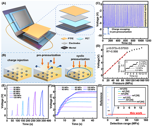 圖4(A) 傳感器結構示意圖。(B) 傳感器工作原理示意圖。(C) 壓力傳感器的穩定性測試。(D) 不同壓力下的電壓輸出 (E) 線性區間內不同壓力下的電壓輸出。(F)電壓輸出穩定性。(G)已報道的聚合物壓力傳感器的可傳感范圍。