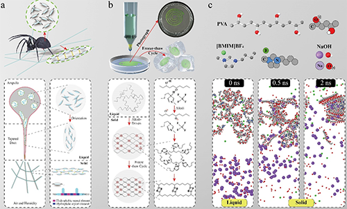 1. 受蜘蛛絲的快速固化過程啟發,制備管狀水凝膠結構的示意圖及分子動力學模擬