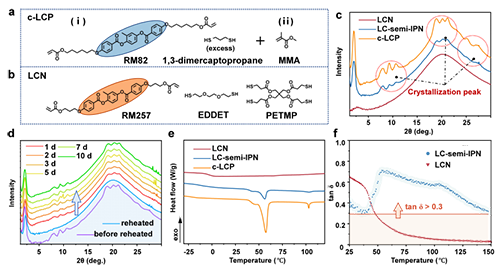 圖2展示了c-LCP與LCN的基本化學結構。c-LCP與LCN的合成均基于硫醇-邁克爾加成反應。c-LCP與LC-semi-IPN的結晶行為可以由X射線衍射分析(XRD)與差示掃描量熱(DSC)進行表征。阻尼因子tanδ是用以判斷聚合物材料阻尼特性的重要參數,通常地,tanδ>0.3的溫度范圍被稱為“有效阻尼溫域”,流變測試結果表明,LC-semi-IPN的有效阻尼溫域高達130℃,遠超于先前報道的LCN阻尼材料。