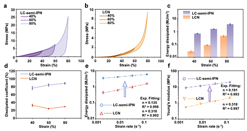 由于c-LCP的引入,LC-semi-IPN也表現出結晶行為,其力學性能也有了明顯提高。圖3與圖4分別展現了LC-semi-IPN在拉伸與壓縮條件下的力學行為。在拉伸測試中,與LCN相比,LC-semi-IPN的楊氏模量提高了18倍。在拉伸-回縮循環實驗中,LC-semi-IPN比LCN展現出更高的能量耗散與能量耗散百分比。改變拉伸測試的應變速率,LC-semi-IPN仍能夠表現出更優的能量耗散性能與力學性能。相似地,在壓縮測試中,在不同的壓縮應變速率條件下,LC-semi-IPN同樣表現出更優的能量耗散性能與力學性能。