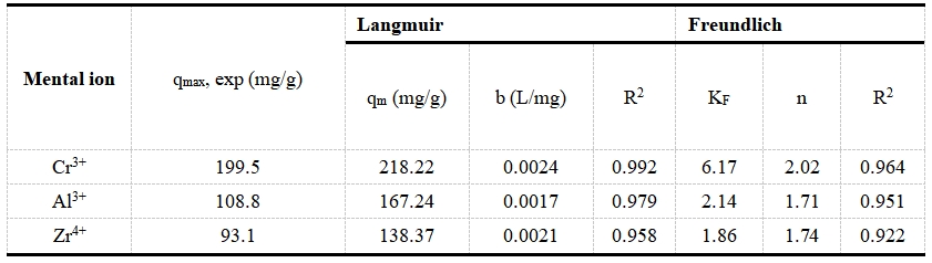 由表1 可以得出Langmuir等溫模型更加適合用于描述CS/CMC-Na吸附Cr3+, Al3+和Zr4+三種金屬離子的吸附行為,說明Cr3+, Al3+和Zr4+在吸附劑的表面發(fā)生了單分子層吸附。并且分子吸附在吸附劑內部穩(wěn)定的活性位點上。Freundlich模型的參數(shù)KF值分別為6.17,2.14和1.86,n值分別為2.02,1.71和1.74。由于參數(shù)KF不同且n值均大于1,表明吸附條件有利于吸附的進行。由于CS/CMC-Na中的殼聚糖含有氨基以及CMC-Na水解后的羧基,因此CS/CMC-Na對三種金屬離子可能存在的吸附方式有靜電吸引、離子交換和配位絡合。此外,由表3可知,CS/CMC-Na吸附Cr3+, Al3+和Zr4+三種金屬離子的最大吸附容量也存在差異。這可能與金屬離子的特性(原子量、價態(tài)、水化半徑、水化能、水解常數(shù)、電 負性、氧化還原電位等);有機配體的化學特性(如官能團的種類等);泰勒效應等有關。