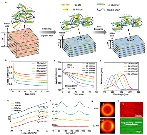 自然界中的結構色是一種令人著迷的現象,光照射到周期性結構表面會通過布拉格反射產生鮮艷的顏色。膽甾相液晶彈性體(CLCE)具有周期性的螺旋結構和高分子網絡,可通過光、熱、電等外部刺激對結構色動態調節。然而,由于高分子網絡一旦形成就無法修改,結構色在撤除外部刺激后會自發恢復到初始狀態,其實際應用受到限制。在交聯網絡中引入動態鍵被認為是一種有效的改進方法。然而,激發動態鍵的交換一般需要高溫或高強度的紫外線等條件,可能對CLCE的周期性結構造成破壞,從而損害其光學特性。由于可見光具有非侵入性和精確控制能力,其在各種激活機制中脫穎而出,通過可見光實現膽甾相液晶彈性體的精確編程是研究人員所追求的目標。