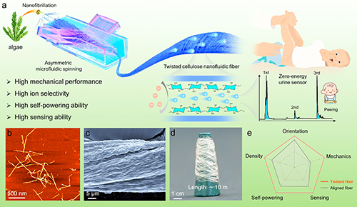 在這項研究中,作者開發了一種前所未有的具有表面扭曲和內部取向結構的扭轉海藻纖維。通過將微流控技術與復雜的非對稱流場相結合,不僅實現了對攜帶負電荷海藻纖維素納米纖維(CNFs)組裝過程的精細控制,且通過表層扭轉結構,纖維直徑顯著減小(33.6至20.4 μm),堆積密度增加(0.87至1.47 g cm-3),斷裂應力增強(468.5 MPa),赫爾曼定向參數增大(從0.77到0.89),結構和性能方面都取得了重大進展。此外,在50倍NaCl鹽度梯度下,具有高性能選擇性離子傳輸(7.8 mS cm-1)和能量收集特性(12.9 W m-2),這些優異的性能賦予了扭轉纖維在自供電監測嬰兒尿液上的檢測靈敏度和準確性。這種扭轉在離子信號傳輸和自供電傳感系統中的巨大潛力表明,它們將在未來的智能技術和健康監測中發揮關鍵作用。