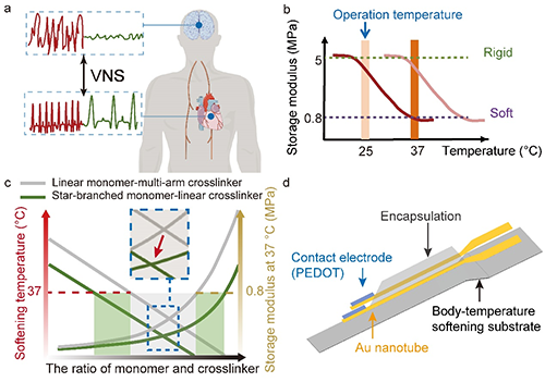 圖1 BIS-PNE 的設(shè)計。a. VNS 神經(jīng)調(diào)節(jié)降低心率和抑制異常神經(jīng)元放電的示意圖;b. 基于動態(tài)力學分析的原位軟化示意圖;c. 隨著單體與交聯(lián)劑比例的增加,軟化溫度和體溫下的儲能模量變化曲線;d. BIS-PNE 的示意圖。