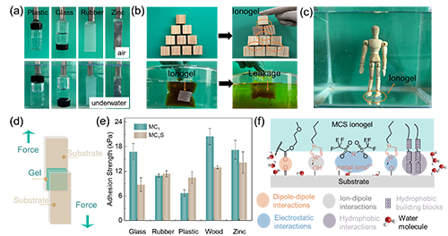圖 2 離子凝膠在不同介質中的粘附性能及粘附機理