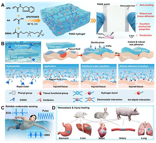 西安交大成一龍教授團隊 Adv. Mater.:一種用于快速止血、加速組織損傷愈合和生物電子學的高濕組織粘附性抗溶脹水凝膠