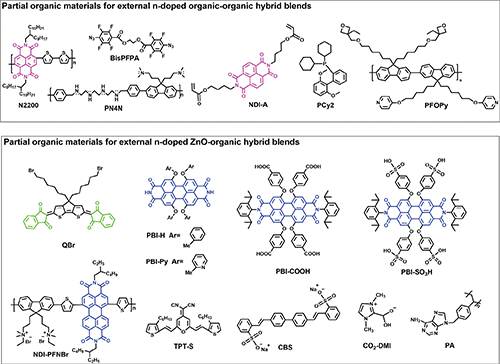 Figure 6. Chemical structures of partial organic materials for external n-doped hybrid blends (including organic–organic and ZnO-organic) in inverted OSCs.