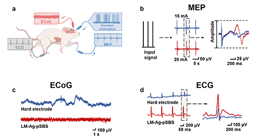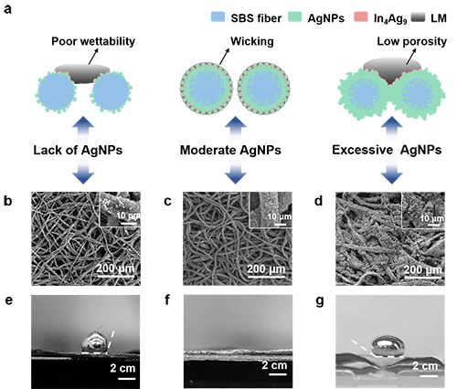圖 1:LM-Ag-pSBS液態(tài)金屬基生物電極的設(shè)計(jì)與制造。a)耐用和長(zhǎng)期生物相容性生物電極的應(yīng)用示意圖。b)長(zhǎng)期生物電極的生物相容性要求:多孔基質(zhì)的透氣透液性和LMs電極的表面順應(yīng)性。c)界面調(diào)控策略提升的LMs浸潤(rùn)性。d) LM-Ag-pSBS電極的制備流程示意圖。