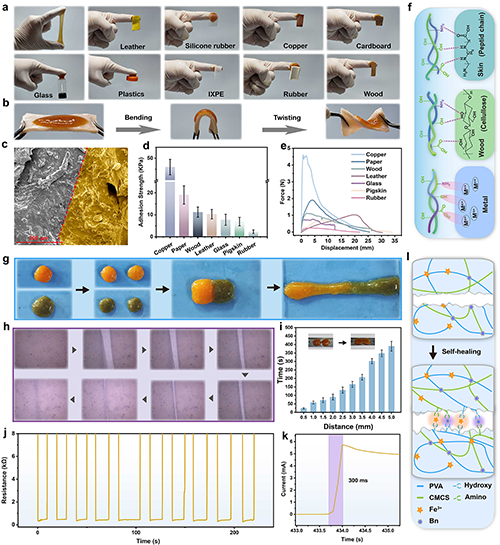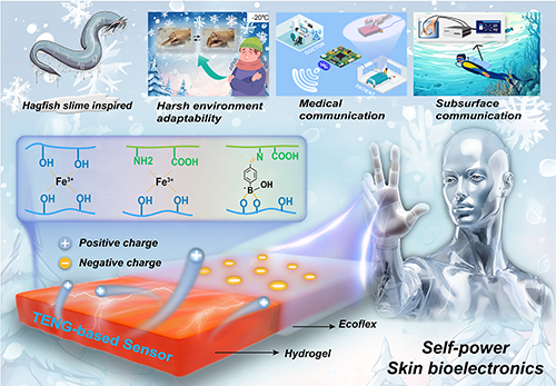 隨著皮膚生物電子學(xué)的進(jìn)步,水凝膠可穿戴設(shè)備在環(huán)境感知和健康監(jiān)測(cè)等方面表現(xiàn)出了巨大前景。然而,它們的應(yīng)用仍受到機(jī)械性能和自愈性能差、環(huán)境敏感性和受限的感知功能的嚴(yán)重阻礙。為應(yīng)對(duì)此挑戰(zhàn),陜科大王學(xué)川教授/黨旭崗副教授團(tuán)隊(duì)受盲鰻黏液的層次結(jié)構(gòu)和獨(dú)特交聯(lián)機(jī)制的啟發(fā),報(bào)道了一種自供電的超分子水凝膠,具有極高的拉伸性、超快的自主自愈能力、高自粘性、可注射性、易成型性、抗菌性和生物相容性。相關(guān)工作被發(fā)表于《Small》 (IF: 13.0)。
