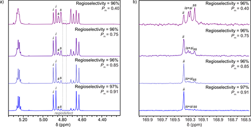 受 (R)-Sc3和(S)-Sc3對(S)-MG的ROP的高區域選擇性和獨特動力學的啟發,作者將該催化系統應用于 rac-MG 單體的選擇性聚合上(圖3)。在常溫條件下,使用(R)-Sc3催化rac-MG 可以得到具有立體復合結構的等規交替PLGA(Regio = 96%,Pm = 0.75),為了進一步提高選擇性,通過降低溫度,在-80 oC條件下,得到高區域選擇性和立體選擇性的等規PLGA(Regio = 97%,Pm = 0.91)。值得注意的是,rac-Sc3雖然提升顯著提高催化活性(TOF = 990 h?1),但幾乎無立體選擇性,(Pm = 0.40)。