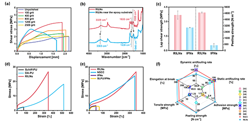 4. 綜合力學性能. (a)不同打磨條件下RILNs的搭接剪切曲線; (b)本體RILNs和環氧基材側的RILNs的紅外光譜圖; (c) RILNsIPNs對照樣的搭接剪切強度和剝離強度; (d)Schiff-PU、DA-PU、RILNs的應力-應變曲線; (e) RILNs、NSCC、IPNs、SLPU/IPNs的應力-應變曲線; (f) NSCCRILNs的動態/靜態防污率、粘接強度、剝離強度、拉伸強度、斷裂伸長率及其與文獻中防污涂層的對比.
