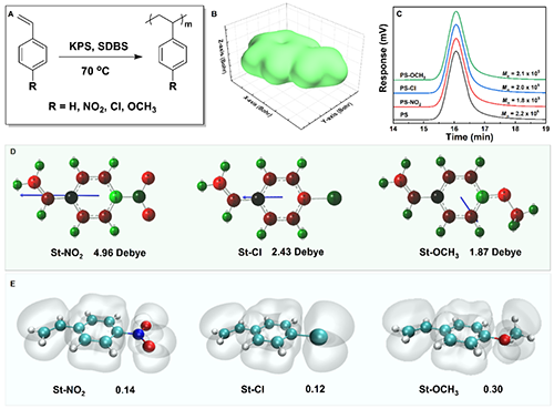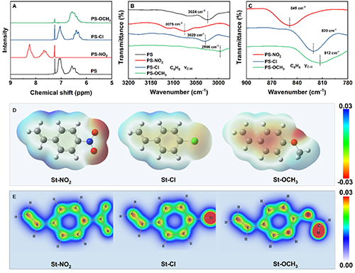 圖2 聚合物結構表征(A、B、C)及取代苯乙烯單體的表面靜電勢圖(D)與π電子密度分布圖(E)