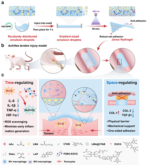 肌腱是由纖維狀粘彈性結締組織構成的堅韌的帶狀結構,它們將肌肉固定在骨骼上,在負荷傳遞和維持正常運動功能等方面起著至關重要的作用。目前,肌腱斷裂的修復仍然依靠手術縫合。在肌腱再生過程中,由于損傷引起的局部炎癥會誘發術后疤痕形成和肌腱粘連,影響修復后肌腱的力學性能并增加再次斷裂的風險。一般在跟腱修復手術后,需要通過皮質類固醇和非甾體抗炎藥來減少炎癥反應并減輕術后疼痛。設計一種能在空間維度上為肌腱修復提供單側免縫合粘附、在時間維度上通過炎癥微環境響應性釋放藥物抑制炎癥發生的水凝膠對高質量的肌腱修復具有重要意義。