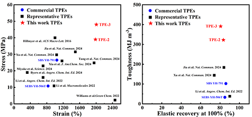 熱塑性彈性體(Thermoplastic Elastomers, TPEs)因其兼具熱塑性塑料的可加工性和傳統橡膠彈性體的高彈性,在汽車、電子、醫療和日用消費品等領域具有廣泛的應用。然而,傳統TPEs材料主要來源于石化資源,用后難以降解回收,會導致嚴重的環境污染問題。開發性能媲美商品化彈性體,同時用后可回收的TPEs是推動材料綠色化發展的關鍵。