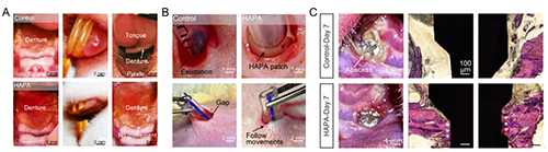 3.廣泛適用于軟組織-醫(yī)用器械界面的即刻位封閉:進一步驗證HAPA貼片的使用效果,研究從單純界面固位模型(義齒基托固位)至經(jīng)皮器械界面封閉預(yù)防感染(經(jīng)皮導(dǎo)管管周固定封閉模型)再至經(jīng)粘膜器械界面載藥封閉抗感染模型(種植體基臺軟組織封閉)多個模擬臨床場景的動物模型中進行驗證,HAPA貼片均展現(xiàn)出優(yōu)異的粘附效果、密封性及生物相容性。這種即刻的固定封閉方式有效降低了感染風(fēng)險,提高了醫(yī)療器械的穩(wěn)定性和安全性,具有廣泛的臨床應(yīng)用價值。
