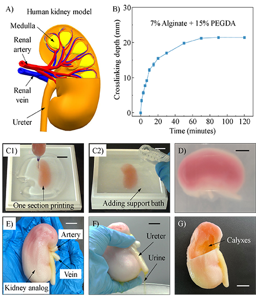 利用具有較高屈服應力及較長觸變響應時間的支撐浴材料,科研團隊實現了高速打印解剖學結構精度的人體腎臟模型。該腎臟模型具有血管,尿管,及內部腔體結構(圖4),可在藥物篩選,器官重建等生物醫學領域起到重要的作用。