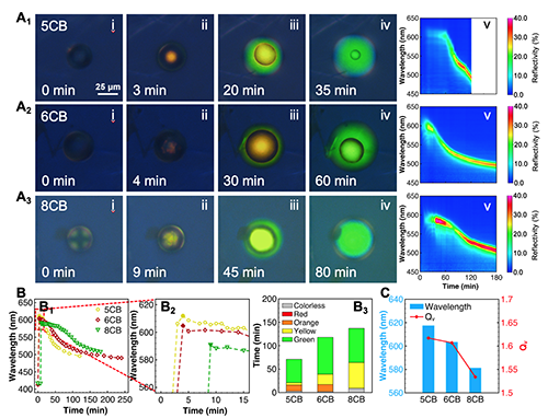 圖3. 40 ?C下5CB、6CB和8CB墨水在FAS-BPPT上的滲透行為和顏色變化過(guò)程。A) 打印點(diǎn)的POM圖像(i-iv)和反射光譜(v),墨水A1) 5CB,A2) 6CB,A3) 8CB,在40 ?C下的情況。B1, B2) 5CB、6CB和8CB墨水打印點(diǎn)的中心波長(zhǎng)(λcenter)和B3) 顏色變化。C) BPPT填充不同墨水時(shí)的λcenter和膨脹比。5CB墨水的打印點(diǎn)表現(xiàn)出最快的顏色變化速率和最寬的顏色變化范圍,而8CB墨水的打印點(diǎn)則表現(xiàn)出最慢的顏色變化速率和最窄的顏色變化范圍。