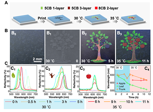 圖6. 用5CB和8CB打印的“生長(zhǎng)中的蘋(píng)果樹(shù)”動(dòng)態(tài)圖案。A) 動(dòng)態(tài)多色圖案的示意圖,通過(guò)采用5CB和8CB的多層打印方式實(shí)現(xiàn)。B) 照片:B0) BPPT,打印的動(dòng)態(tài)蘋(píng)果樹(shù),B1) 0小時(shí),B2) 30 ?C下5小時(shí)后,B3) 35 ?C下11小時(shí)后。C) 圖案的反射光譜:C1) 葉子,C2) 樹(shù)干,C3) 蘋(píng)果。C4) 加熱時(shí)葉子、樹(shù)干和蘋(píng)果圖案的中心波長(zhǎng)(λcenter)變化。