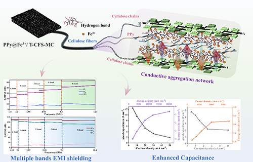 在本項(xiàng)研究中,制備了一種具有增強(qiáng)電容和多波段EMI屏蔽性能的纖維素纖維基復(fù)合材料。構(gòu)建的聚吡咯(PPy)@Fe3+-TEMPO纖維素纖維多功能復(fù)合材料(PPy@Fe3+ / T-CFS-MC)在 5 mA cm?2 電流密度下表現(xiàn)出約 12.44 F cm?2的高面積比電容和 3.99 mWh cm?2 的高面積能量密度,在 50 mA cm?2 電流密度下經(jīng)過 10,000 次循環(huán)后仍具有 90.23% 的優(yōu)異穩(wěn)定性。此外,該材料通過多尺度界面結(jié)構(gòu)設(shè)計(jì) (CFS)、微觀結(jié)構(gòu)優(yōu)化 (TEMPO 氧化) 以及磁性成分 (Fe3+) 和導(dǎo)電聚合物 (PPy) 的加入,實(shí)現(xiàn)了出色的多波段電磁屏蔽性能。L、S、C 和 X 波段的 EMI 值超過 100 dB。本項(xiàng)工作所提出的研究策略為生物基材料在儲能和 EMI 屏蔽等領(lǐng)域的應(yīng)用鋪平了道路,有助于實(shí)現(xiàn)更加可持續(xù)的未來。