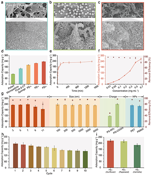 花粉-甲殼素海綿吸附納米塑料機制:通過水接觸角(圖4a)、zeta電位(圖4b)、紅外(圖4c)、固體核磁(圖4d)、XPS(圖4e)等表征對花粉-甲殼素海綿去除納米塑料的機制進行了探索,結(jié)果發(fā)現(xiàn),納米塑料吸附機制包括疏水、物理截留、靜電和氫鍵相互作用(圖4f)。花粉-甲殼素海綿的疏水性、表面電荷及乙酰氨基、多酚或黃酮等關(guān)鍵組分在吸附中發(fā)揮重要作用。