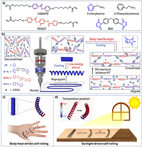 圖1.(a)用于制備低Tni DALCE的材料組分的化學結構。(b) 摻雜CNT的DALCE致動器的重新編程過程示意圖。DALCE致動器在(c)溫暖皮膚或(d)自然陽光下自持續滾動的示意圖。