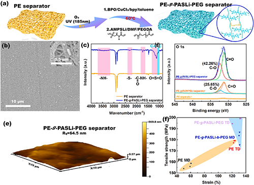 圖一. PE-g-PASLi-PEG隔膜的制備過程及其的物理表征。