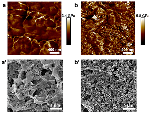 圖2展示了等溫結(jié)晶后PLLA/PDLA共混物及其與CNCs-PMMA的復合材料的結(jié)晶形態(tài)。PLLA/PDLA共混物的模量AFM圖中(圖2a)可觀察到多條具有較高模量的彎曲條紋,其周圍則分布有模量相對較低的區(qū)域。結(jié)合對樣品晶型的表征,可判斷這些高模量和低模量區(qū)域分別對應著SC晶和非晶相。不同于PLLA/PDLA共混物,CNCs-PMMA復合材料中的高模量區(qū)域不再呈現(xiàn)為條紋狀,而是形成了密集的網(wǎng)絡結(jié)構(gòu)(圖2b)。將樣品淬斷面蝕刻后所得的SEM圖像(圖2a’和2b’)進一步驗證了AFM-QNM的結(jié)果。通過選擇性刻蝕去除樣品中的非晶區(qū)后,可以清晰地觀察到PLLA/PDLA/CNCs-PMMA復合材料中的網(wǎng)絡結(jié)構(gòu)密度明顯更高,SC晶相互交織,形成了類似珊瑚的三維結(jié)構(gòu)。