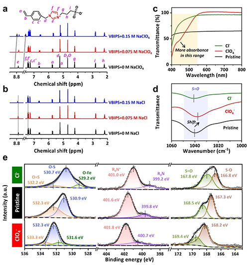 1H NMR光譜結(jié)果顯示,陽(yáng)離子咪唑環(huán)上H原子的信號(hào)在加入NaClO4后發(fā)生明顯偏移,表明VBIPS和ClO4-離子產(chǎn)生了相互作用。而NaCl體系中沒(méi)有觀察到類(lèi)似現(xiàn)象。同時(shí),可見(jiàn)光光譜、紅外光譜和XPS都顯示出類(lèi)似結(jié)果。這些結(jié)果表明VBIPS中的陽(yáng)離子咪唑基團(tuán)能通過(guò)與ClO4-離子結(jié)合來(lái)消除其對(duì)鐵離子的靜電排斥作用,從而使鐵離子更好地與磺酸根產(chǎn)生相互作用。為驗(yàn)證該結(jié)論,作者還使用Fe(ClO4)3溶液處理pDVBAPS水凝膠(含苯環(huán)但陽(yáng)離子單元為普通季銨鹽結(jié)構(gòu))和pSBMA水凝膠(無(wú)苯環(huán)且陽(yáng)離子單元為季銨鹽結(jié)構(gòu))。結(jié)果發(fā)現(xiàn)Fe(ClO4)3不能強(qiáng)化上述兩種兩性離子水凝膠。這一結(jié)果再次表明咪唑陽(yáng)離子結(jié)構(gòu)與ClO4-離子結(jié)合在鐵鹽強(qiáng)化pVBIPS水凝膠的過(guò)程中發(fā)揮重要作用。