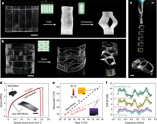 4.多功能拓展性納米限域的增強效應(yīng)還可以擴展到其他單體和溶劑體系,從而設(shè)計出具有特定功能的高性能材料。例如,通過納米限域效應(yīng),可以將有機溶劑與水凝膠網(wǎng)絡(luò)結(jié)合,制備出具有超越傳統(tǒng)自修復(fù)彈性體的機械性能和粘附性能的有機水凝膠。此外,可將不同二維材料插入納米限域中,實現(xiàn)非傳統(tǒng)凝膠功能。例如通過在粘土片層間嵌入MXene等納米材料,水凝膠不僅具備紅外反射驅(qū)動的熱偽裝能力,還展現(xiàn)出GHz頻段的電磁屏蔽特性。這種普適性設(shè)計可拓展至多種凝膠體系,為開發(fā)兼具力學(xué)強度與復(fù)雜功能的先進軟材料提供全新范式。