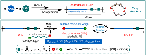 聚烯烴全球年產量2.5億噸,是名副其實的第一大高分子材料。我國聚烯烴占全球約1/3,其中聚乙烯(PE)產能>3000萬噸/年;其發展水平直接衡量國家的化學工業水平。聚烯烴的高性能化與可持續化是當前全球學術界與工業界的焦點,聚烯烴可控合成是高分子學科的重點方向。將“活性”的酯基(-COO-)嵌入PE主鏈可實現PE的可持續化、安裝在PE側鏈可實現PE的高性能化(功能化);但如何精確將酯基均勻分布在PE主鏈、如何安裝酯基在PE側鏈并同時保持高分子量,是兩個極具挑戰性課題(圖1)。