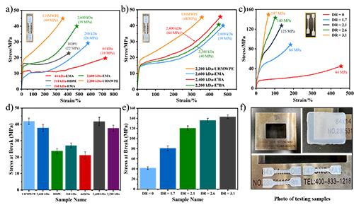 圖7. UHMW乙烯-丙烯酸酯共聚物性能:分子量對乙烯-丙烯酸酯共聚物的機械性能有著顯著提升、UHMW乙烯-丙烯酸酯共聚物拉伸強度達到44 MPa、預拉伸處理后UHMW乙烯-丙烯酸酯共聚物材料拉伸強度急劇增加至147 MPa
