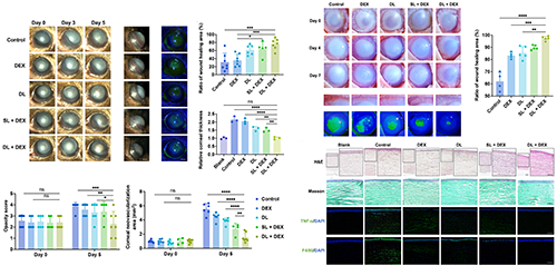 圖 3. 黏附/潤滑的“兩面神”載藥納米涂層治療小鼠和兔的角膜損傷模型