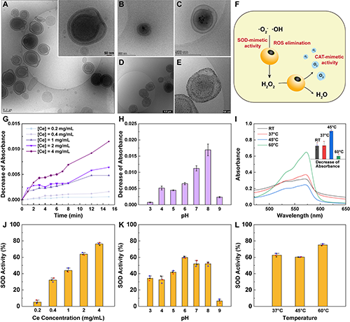 圖2.(A-E)不同階段Stomatocytes的cryo-TEM圖;(F)Ce/Au-Stomatocytes的類酶活性作用機制;(G-I)不同條件下Ce/Au-Stomatocytes的類CAT酶活性;(J-L)不同條件下Ce/Au-Stomatocytes的類SOD酶活性。