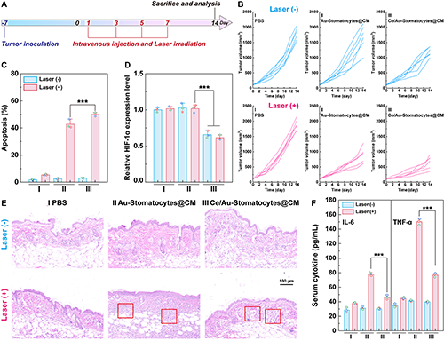 圖6.(A)體內抗腫瘤治療時間線;(B)治療期間各組小鼠腫瘤體積變化;治療后各組小鼠(C)腫瘤細胞凋亡率及(D)HIF-1α表達水平;治療后各組(E)腫瘤外側皮膚的H&E 染色分析及(F)血清中細胞因子的表達情況。