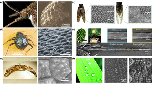 圖 9. 多功能海洋防護(hù)表面(II):(a)用于泰勒-庫埃(Taylor-Couette)系統(tǒng)的超疏水表面;(b)聚氨酯(PU)與多尺度顆粒水下自修復(fù)超疏水涂層;(c)金字塔形超疏水表面;(d)防冰和減阻應(yīng)用的納米復(fù)合材料(NMAD)表面。