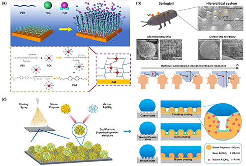 全球?qū)δ茉聪摹h(huán)境污染以及可持續(xù)發(fā)展的日益關(guān)注,推動(dòng)了學(xué)術(shù)界對先進(jìn)表面工程解決方案的深入研究,并促進(jìn)了相關(guān)技術(shù)的開發(fā)與創(chuàng)新。當(dāng)前,超浸潤材料技術(shù)的發(fā)展主要圍繞三種關(guān)鍵微觀結(jié)構(gòu)設(shè)計(jì):賦予超疏水性的微/納米分層結(jié)構(gòu)、實(shí)現(xiàn)超疏油性的凹角特征結(jié)構(gòu),以及達(dá)到超全疏性的雙重凹角結(jié)構(gòu)設(shè)計(jì)。這些結(jié)構(gòu)設(shè)計(jì)策略已成功應(yīng)用于新型環(huán)保材料的開發(fā)。近期研究表明,環(huán)境友好型表面材料取得了顯著進(jìn)展,這些技術(shù)進(jìn)步通過減少資源消耗、提升能源效率和降低化學(xué)污染等多重途徑,為環(huán)境可持續(xù)發(fā)展提供了有力支持。然而,該領(lǐng)域仍面臨諸多挑戰(zhàn),例如長期耐久性不足、成本效益化難度較大,以及對環(huán)境影響的理解尚不全面等問題。因此,在開發(fā)下一代超浸潤材料過程時(shí),重點(diǎn)關(guān)注性能優(yōu)化與環(huán)境考量之間的平衡具有重要意義。