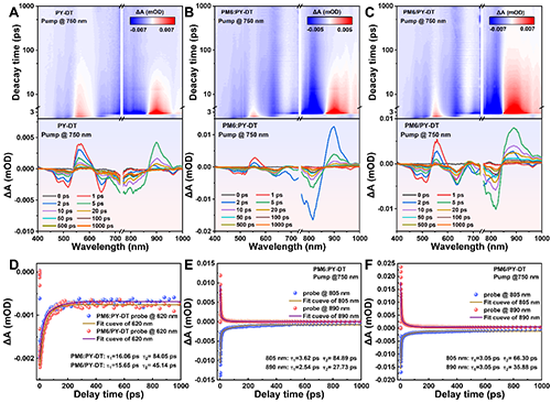 圖6.(A-C)750 nm激發(fā)下PY-DT和共混薄膜的TA光譜;(D-F)共混薄膜在特定波長(zhǎng)下的動(dòng)力學(xué)曲線。