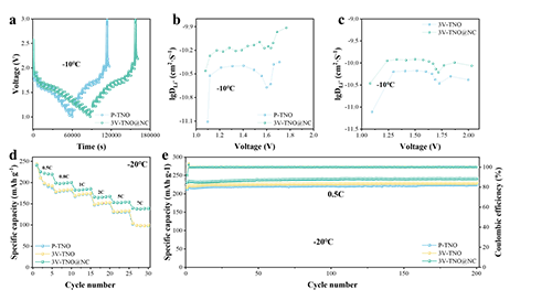 為了考察其實(shí)際應(yīng)用潛力, P-TNO和3V-TNO@NC作為電極材料的扣式電池被測試了低溫性能。在-10°C時(shí),P-TNO和3V-TNO@NC在放電過程中的lg分別為-11.11至-10.33和-10.45至-9.90;在充電過程中分別為-11.09至-10.16和-10.46至-9.91。接下來,測試并分析了低溫下的倍率性能。在-20°C時(shí),3V-TNO@NC在0.5、0.8、1C、2C、5C和7C下分別表現(xiàn)出225.52、198.78、183.52、165.92、153.24和138.54 mAh/g的優(yōu)異比容量,顯著優(yōu)于3V-TNO和P-TNO。最后,三種電極均表現(xiàn)出優(yōu)異的循環(huán)性能,特別是3V-TNO@NC,在200次循環(huán)后仍保持240.6 mAh/g。