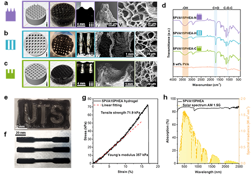 圖2. 3D打印水凝膠的性能表征。分別展示了3D打印的(a) 5PVA15PHEA-N、(b) 5PVA15PHEA-H 和 (c) 5PVA15PHEA-C 水凝膠的:(i) 設計的三維模型,(ii) 實物圖像(其中5PVA15PHEA-H樣品在水中從上方拍攝,以突出貫通孔結構,輕微的孔形變來自不均勻的溶脹),(iii) 縱剖面光學圖像,(iv) 橫截面SEM圖像,及(v) 放大后的SEM圖像,分別展示5PVA15PHEA-N的凸起結構孔隙、5PVA15PHEA-H的通孔結構、以及5PVA15PHEA-C的凹陷結構。(d) 打印的5PVA15PHEA-N、H 和 C 水凝膠的傅里葉變換紅外(FT-IR)光譜,圖中包括一組5 wt%純PVA水凝膠作為對照樣品。(e) 為打印所得三維圖案實物圖(總高度為4 mm,內凹的“UTS”圖案深度為2 mm);(f) 為用于拉伸測試的三組ASTM(E8)子尺寸水凝膠標準試樣實物圖。(g) 顯示5PVA15PHEA水凝膠在拉伸測試中的應力-應變曲線;(h) 展示該水凝膠的紫外-可見-近紅外吸收光譜,以及歸一化的AM 1.5 G太陽光譜(淺黃色區域),波長范圍為300–2500 nm。