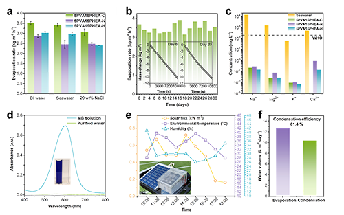 圖4. 3D打印水凝膠的海水淡化與水凈化性能。(a) 5PVA15PHEA-C、N、H 三種水凝膠在去離子水、海水和模擬鹽水(20 wt% NaCl 溶液)中的蒸發速率。每個誤差棒表示至少三個樣品之間的差異;(b) 5PVA15PHEA-C 在海水中連續四周的蒸發性能,插圖顯示其在暴露海水6天和20天后的SSG性能變化;(c) 5PVA15PHEA-C、N 和 H 水凝膠構建的太陽能蒸汽發生器在淡化前后海水中四種主要離子(Na?、Mg2?、K?、Ca2?)的濃度變化;(d) 5PVA15PHEA-C 水凝膠用于太陽能蒸汽純化含染料(亞甲基藍,MB)模擬廢水前后的紫外-可見吸收光譜,插圖為SSG處理前后MB溶液的外觀照片對比;(e) 2024年10月7日于澳大利亞悉尼進行戶外SSG測試期間的環境溫度、濕度和太陽輻照強度,插圖為自制戶外SSG裝置實拍圖;(f) 戶外SSG裝置的蒸發與冷凝水體積統計結果。