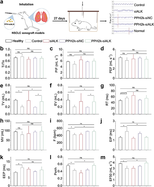 在小鼠原位肺癌異種移植模型中,通過吸入給藥的PPH-siRNA復合物能有效靶向肺部腫瘤,顯著抑制ALK+ NSCLC腫瘤的生長并延長荷瘤小鼠生存期(圖7),同時通過系統性肺功能測試證實其對呼吸參數無明顯不良影響,未引發氣道阻塞或炎癥損傷,表明該吸入式基因療法在高效抑制腫瘤的同時具備良好的肺部安全性(圖8)。組織學分析證實其通過特異性抑制ALK表達及下游信號通路發揮抗腫瘤作用,且未觀察到主要器官的病理損傷,表明該吸入式基因遞送系統兼具靶向性、有效性和生物安全性。
